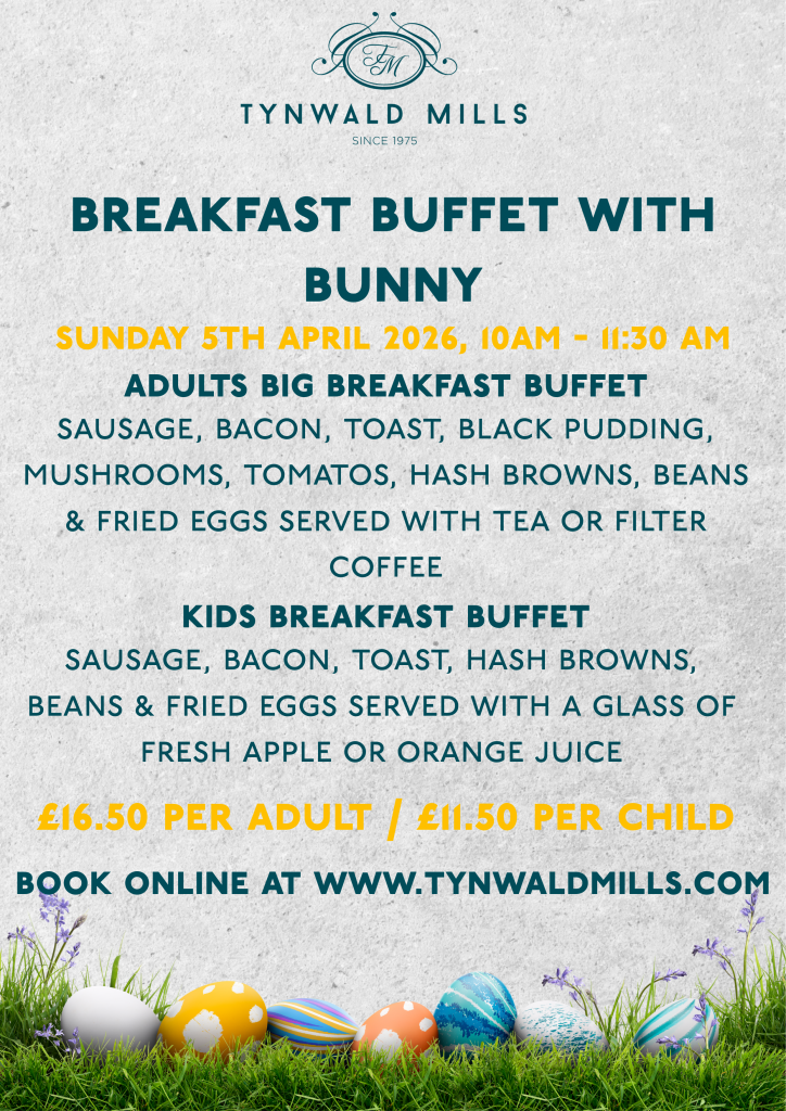 Join us for a magical Breakfast with Bunny at Tynwald Mills on Sunday 5th April, from 10am–12pm, hosted in the cosy surroundings of the Neb Café.